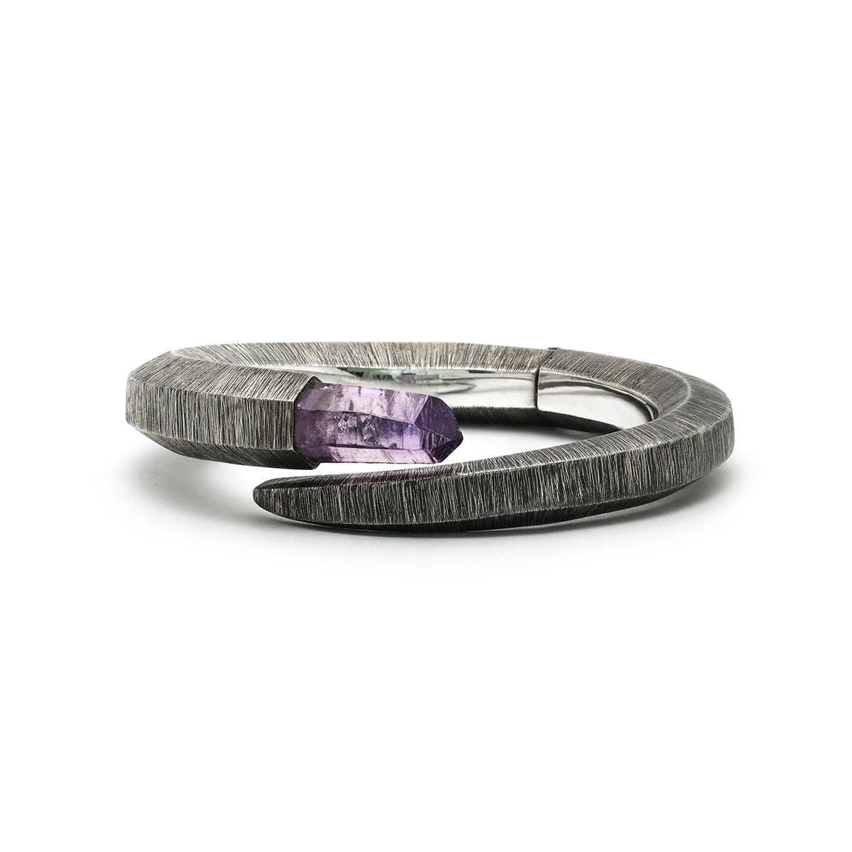 The creation of this bracelet is a particularly involved process, as there is minimal soldering. Instead a majority of the silver itself was bent into shape, and then etched and oxidized. Accented by crystals that are set into the bracelet. Due to the hinge in the bracelet it is easy to wear.